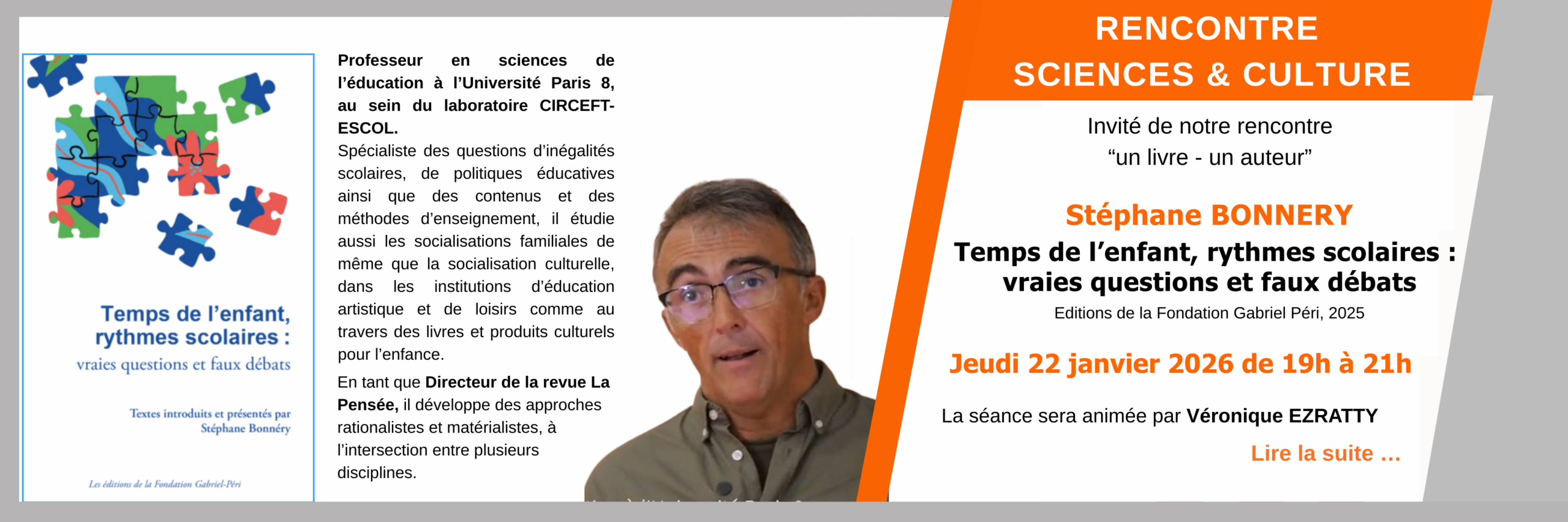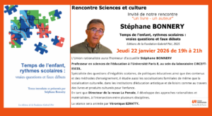 Jeudi 22 janvier 2026 – Invité de notre rencontre, Stéphane BONNERY pour présenter son ouvrages : Temps de l’enfant, rythmes scolaires :