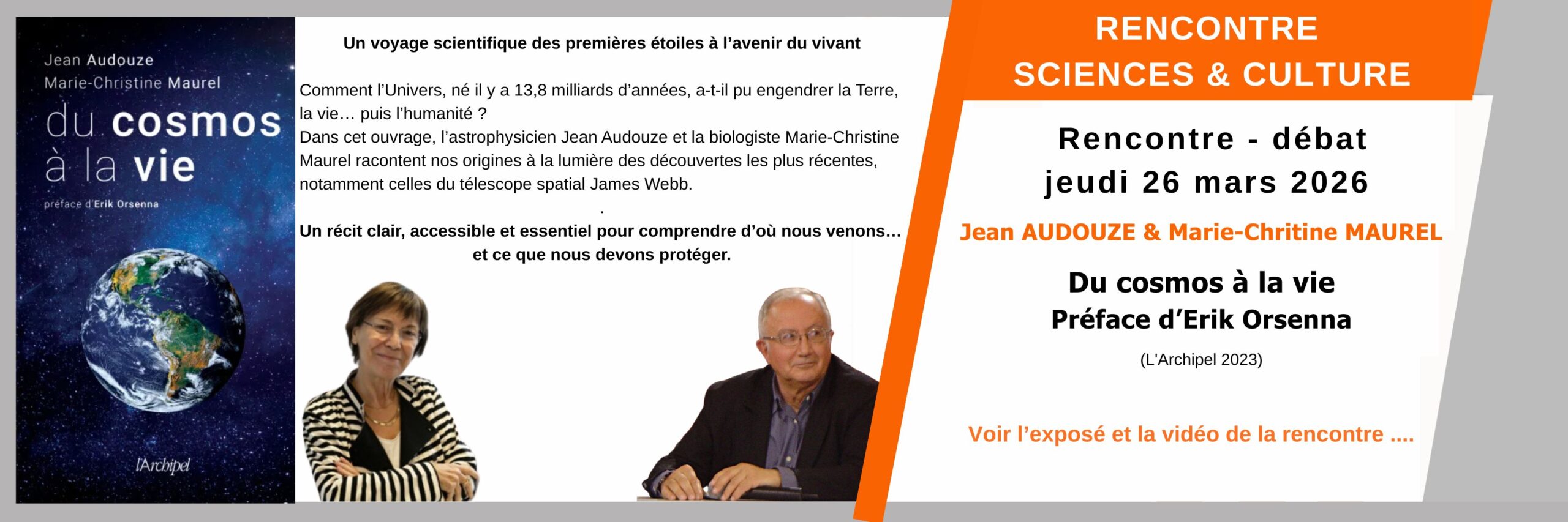Jeudi 26 mars 2026 – Invités de notre conférence débat, Jean AUDOUZE & Marie-Christine MAUREL pour présenter leur ouvrage : Du cosmos à la vie”