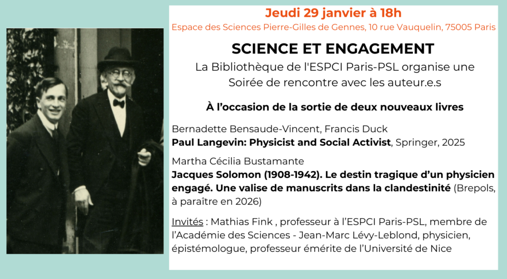 Jeudi 29 janvier 2026 – La Bibliothèque de l’ESPCI Paris-PSL organise une rencontre avec les auteur.e.s à l’occasion de le sortie de deux nouveaux livres Bernadette Bensaude-Vincent et Francis Duck : Paul Langevin: Physicist and Social Activist, Springer, 2025. Bustamante Jacques Solomon (1908-1942). : Le destin tragique d’un physicien engagé. Une valise de manuscrits dans la clandestinité (Brepols, à paraître en 2026)