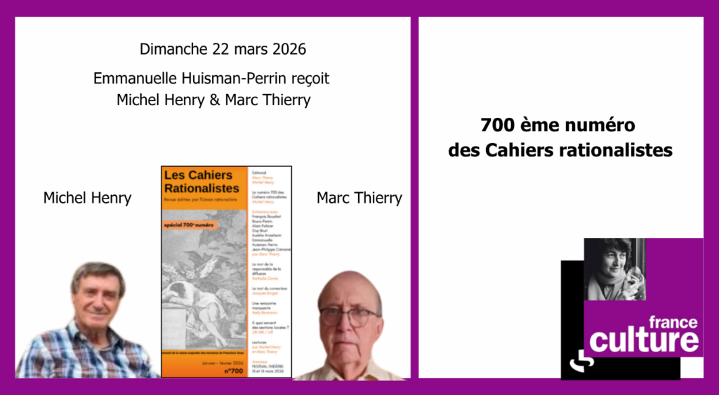 Emmanuelle Huisman-Perrin reçoit Michel Henry, Enseignant chercheur honoraire en mathématiques à l’Université de Franche Comté et administrateur de l’Union rationaliste sous les présidences de Jean Pierre Kahane, Hélène Joliot-Langevin,Edouard Brézin et Yves Bréchet, infatigable militant de la raison, et Marc Thierry , mathématicien indépendant et Rédacteur en chef des Cahiers rationalistes pour évoquer avec eux leur engagement et leurs combats à l’Union rationaliste et le numéro 700 des Cahiers rationalistes.