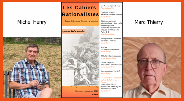 Emmanuelle Huisman-Perrin reçoit Michel Henry, Enseignant chercheur honoraire en mathématiques à l’Université de Franche Comté et administrateur de l’Union rationaliste sous les présidences de Jean Pierre Kahane, Hélène Joliot-Langevin,Edouard Brézin et Yves Bréchet, infatigable militant de la raison, et Marc Thierry , mathématicien indépendant et Rédacteur en chef des Cahiers rationalistes pour évoquer avec eux leur engagement et leurs combats à l’Union rationaliste et le numéro 700 des Cahiers rationalistes.